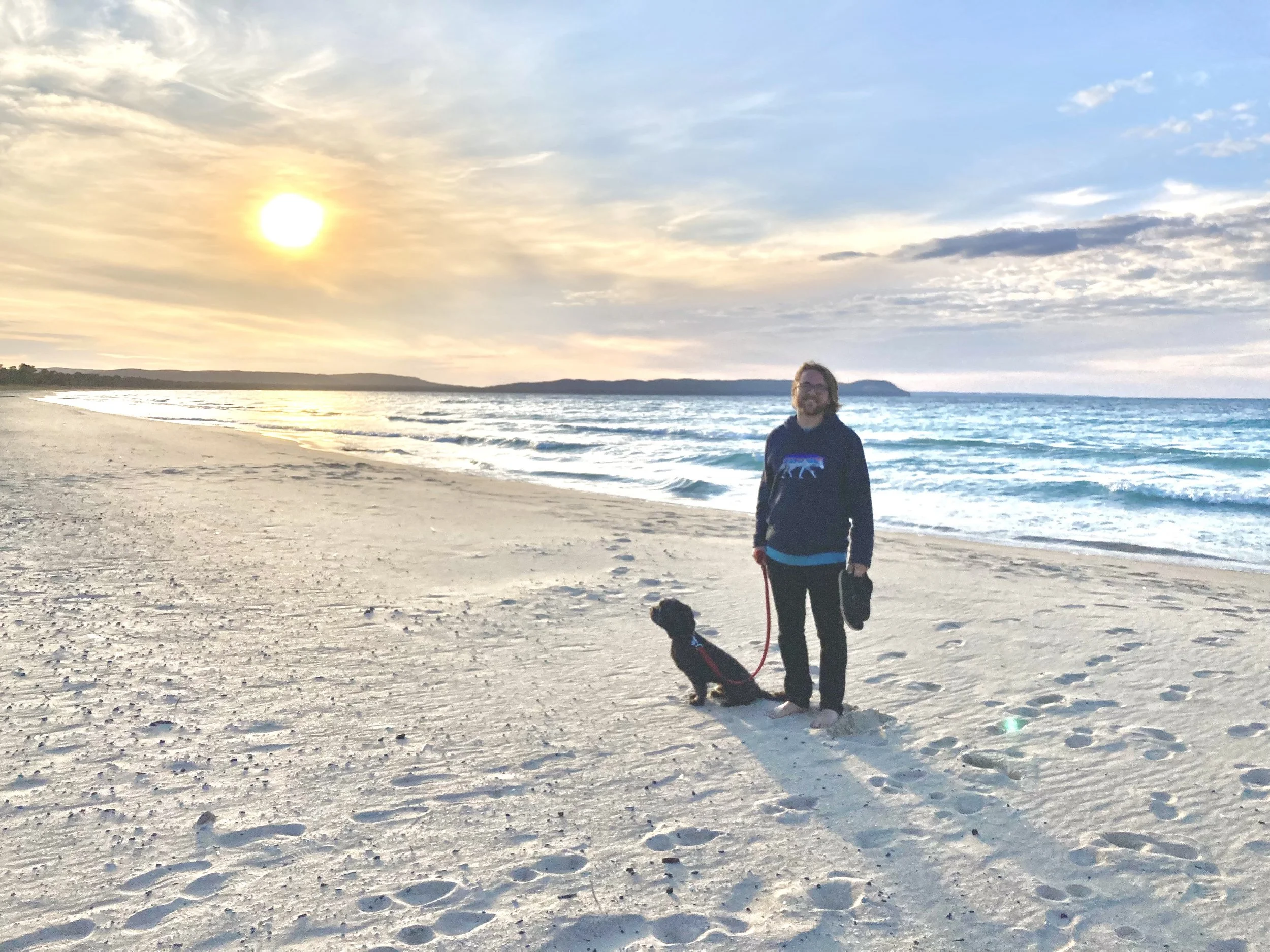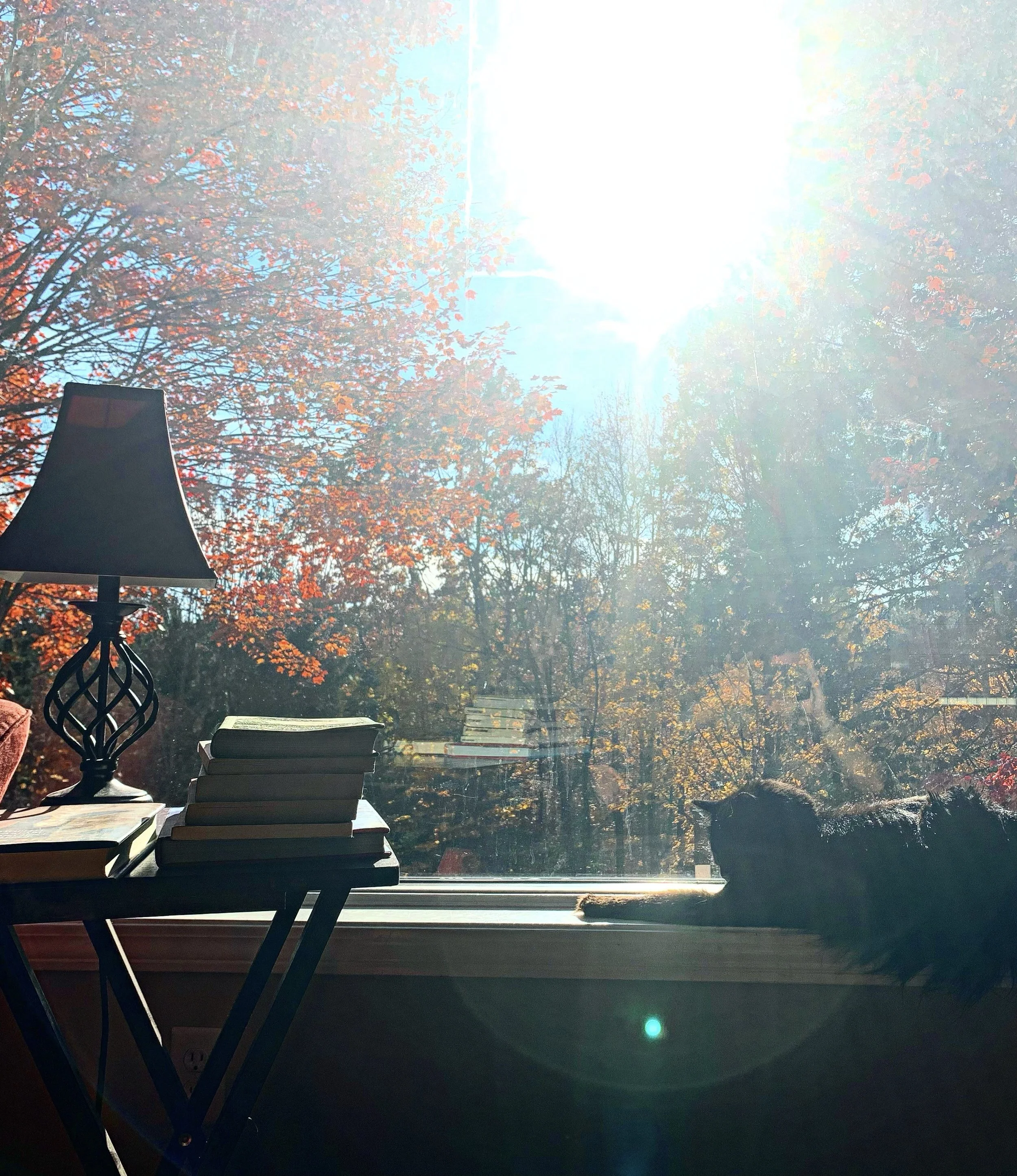 I’ve settled back in my hometown in northern Michigan with my wife and our family of animals. (In one photo on this page, you’ll find our cat near my favorite window and writing spot.) I am fortunate in that I now have the freedom to work and pursue my passions simultaneously, and I can only hope I will continue to have that privilege. Creative inspiration abounds, as in the autumn colors behind Izzy on the window sill.